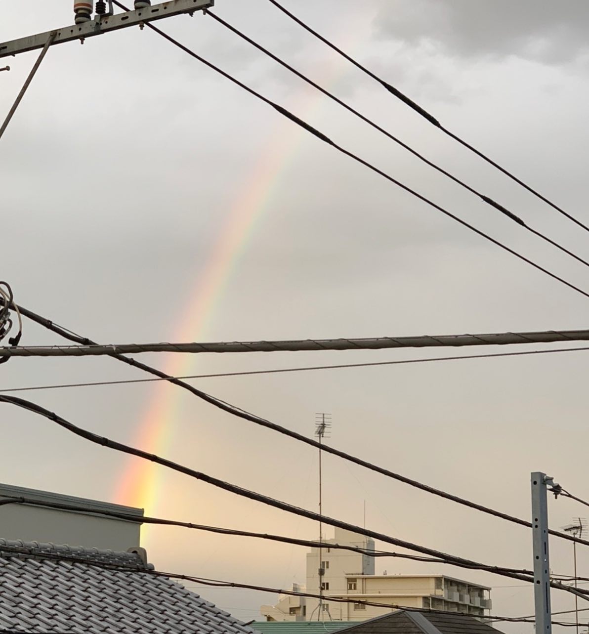 昨日の夕方、虹が🌈出てた〜✨ 電線ばっかりで残念だけど、 見れて良かったー♪なんか癒された☺️ #虹#🌈#癒された